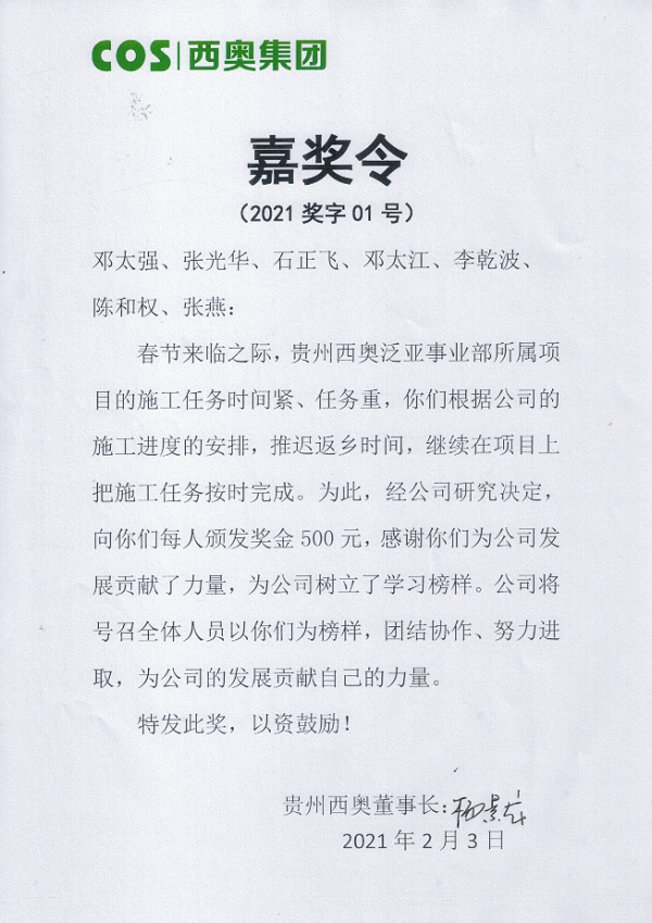 春節(jié)來臨之際,貴州西奧泛亞事業(yè)部所屬項目的施工任務(wù)刻不容緩,西奧產(chǎn)業(yè)工人鄧太強(qiáng)、張光華、石正飛、鄧太江、李乾波、陳和權(quán)、張燕等7人根據(jù)施工進(jìn)度的安排,推遲返鄉(xiāng),繼續(xù)在項目上把施工任務(wù)按時完成。為此,經(jīng)公司研究,決定對這些產(chǎn)業(yè)工人給予嘉獎。