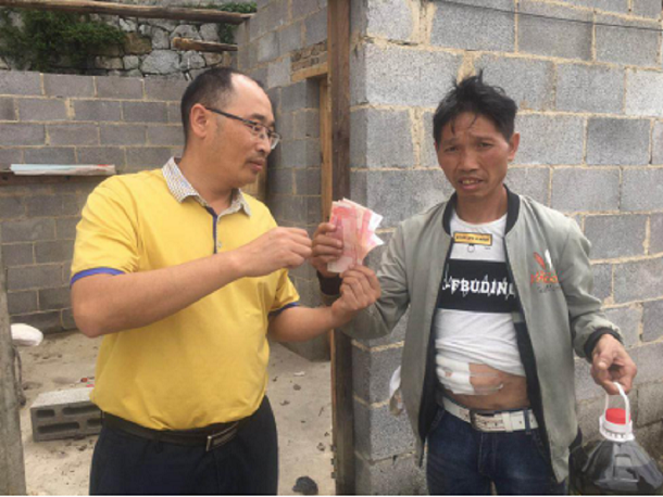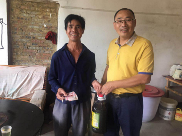 圖為公司董事長楊景龍為陳和篩送去食用油和慰問金。