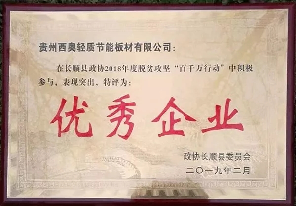 2月24日,政協(xié)長(zhǎng)順縣第九屆委員會(huì)第三次會(huì)議上,貴州西奧輕質(zhì)節(jié)能板材有限公司等11家委員企業(yè)被表彰為長(zhǎng)順縣政協(xié)2018年度脫貧攻堅(jiān)“百千萬行動(dòng)”優(yōu)秀企業(yè)。